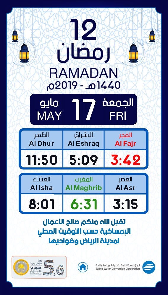 Prayer And Fasting Schedule In Ramadan 2019 In Riyadh Saudi Arabia English Arabic By The Clear Evidence Medium