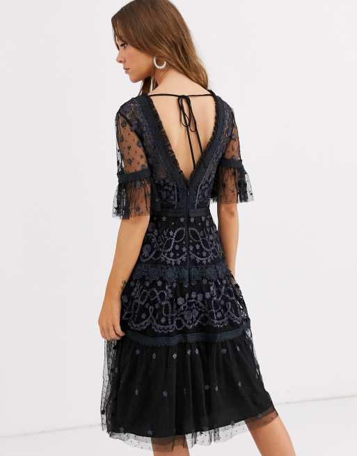 Needle Thread Embroidered Lace Midi Dress In Black And Charcoal Blue Asos