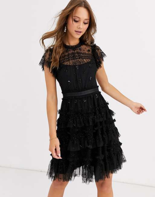 Needle Thread Embroidered Tiered Mini Dress In Black Asos