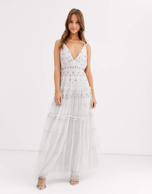 Needle Thread Embellished Plunge Maxi Dress In Grey Asos
